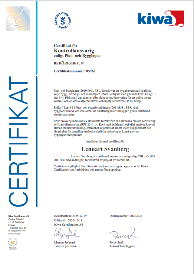 Som kontrollansvarig är vi er stöttepelare i byggprocessen och vi har varit med om hundratals hus från byggstart till inflyttning. Att vara byggherre ställer stora krav, som man inte alltid är medveten om. Entreprenadvärlden med sina sidor är kanske också en ny bekantskap. Man bygger inte så många hus i livet och det är en fördel att anlita någon som varit med om många projekt som kontrollansvarig. Vår ambition är att ni skall flytta in i ett så felfritt hus som möjligt.