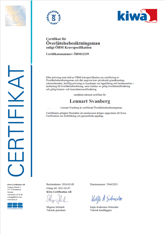 Certifikat KIWA överlåtelsebesiktningsman